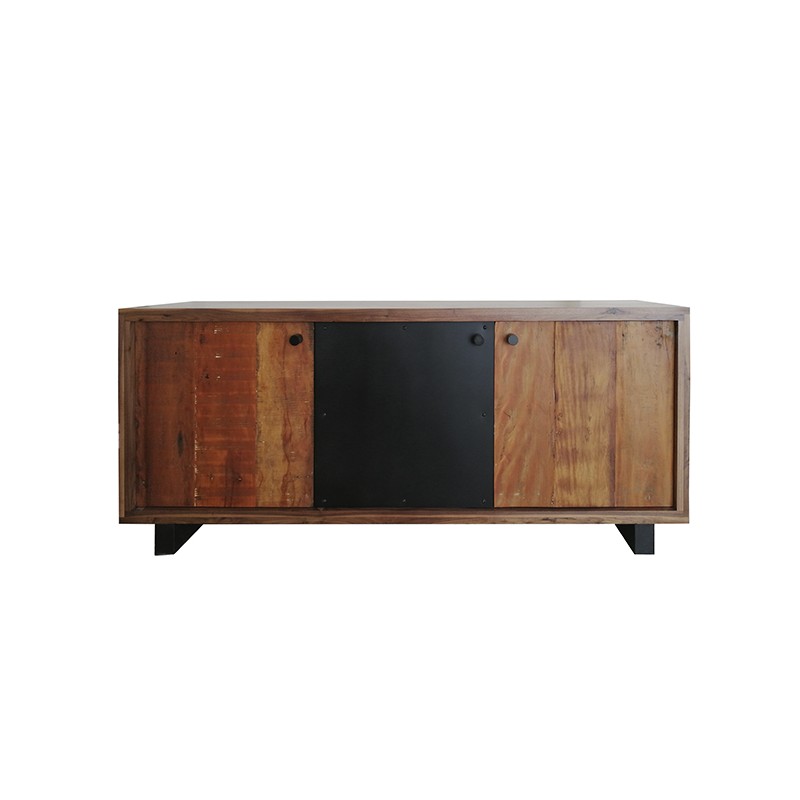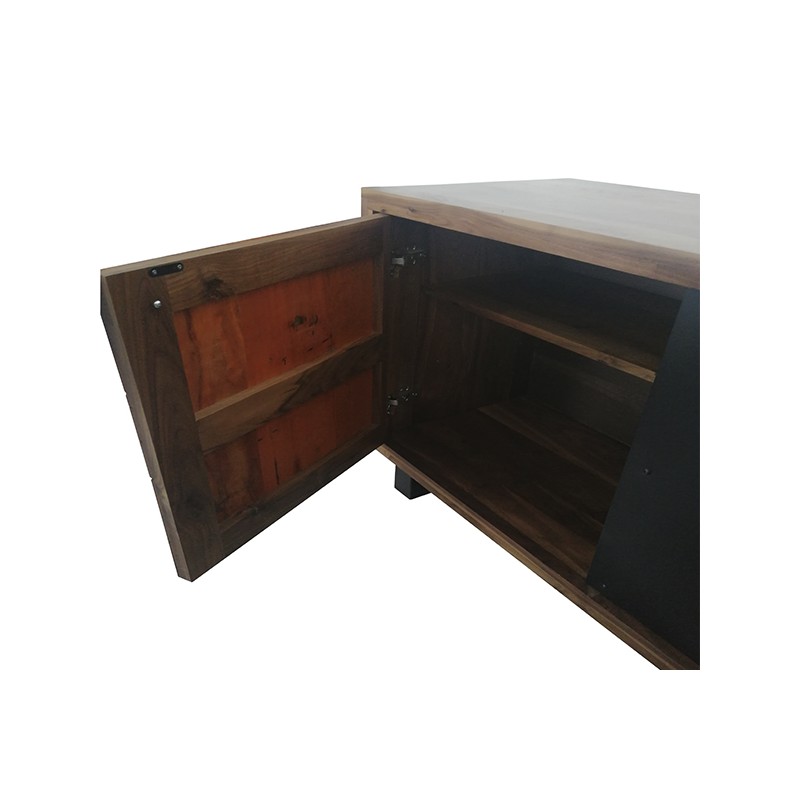 Bufetera 3 Puertas cafeto, cubierta con nogal, con acentos de madera peroba, que es rescatada de viejos cafetales de Brasil. Posee herrería negra, que le da un acento contemporáneo.