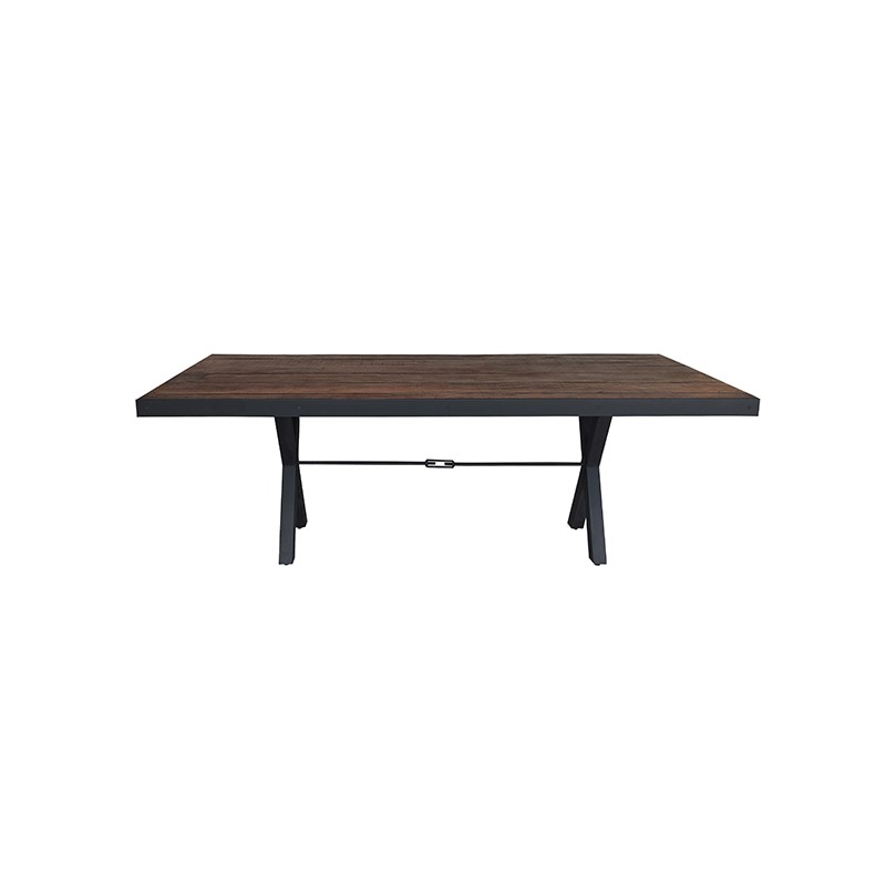 Mesa comedor-240 cafeto única pieza, diseñada con madera peroba, que es rescatada de viejos cafetales de Brasil. Posee herrería negra, que le da un acento contemporáneo.