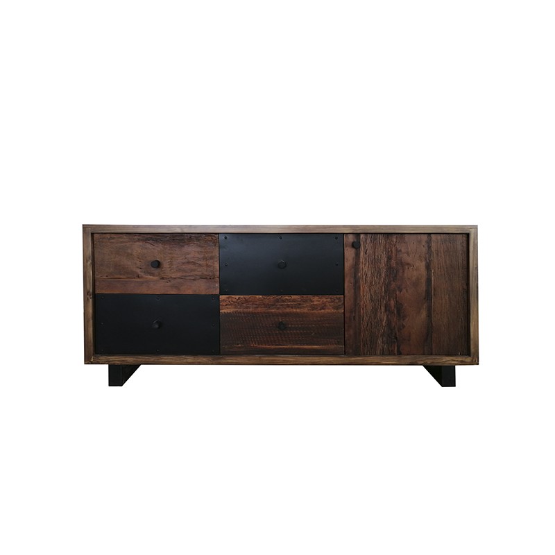 Cómoda buffet 4 Cajones 1 Puerta cafeto, cubierta con pino en acabado nogal, con acentos de madera peroba, que es rescatada de viejos cafetales de Brasil. Posee herrería negra, que le da un acento contemporáneo.