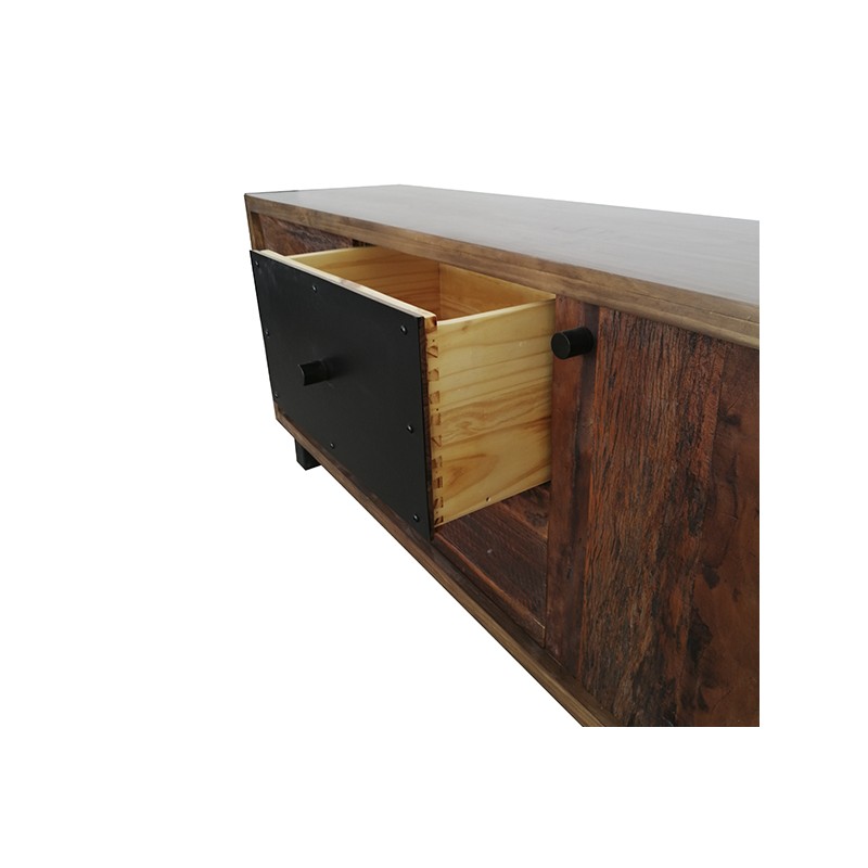 Cómoda buffet 4 Cajones 1 Puerta cafeto, cubierta con pino en acabado nogal, con acentos de madera peroba, que es rescatada de viejos cafetales de Brasil. Posee herrería negra, que le da un acento contemporáneo.