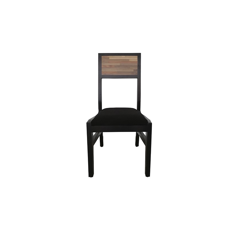 Silla reciclato con corte contemporáneo. Elaborada con pino en acabado negro. El respaldo está hecho con maderas duras, tanto nuevas y antiguas, ensambladas, que le dan un carácter único.